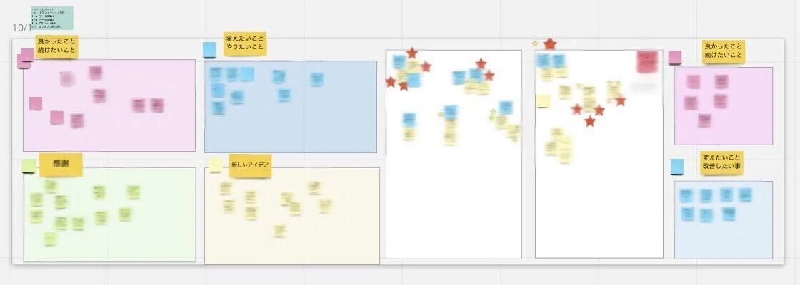 成本さんのチームでは毎週金曜日にレトロスペクティブを行っています。この日はファシリテーターとして他チームの千田さんが来てくれました!レトロスペクティブにはMiroというホワイトボードツールを使っています。