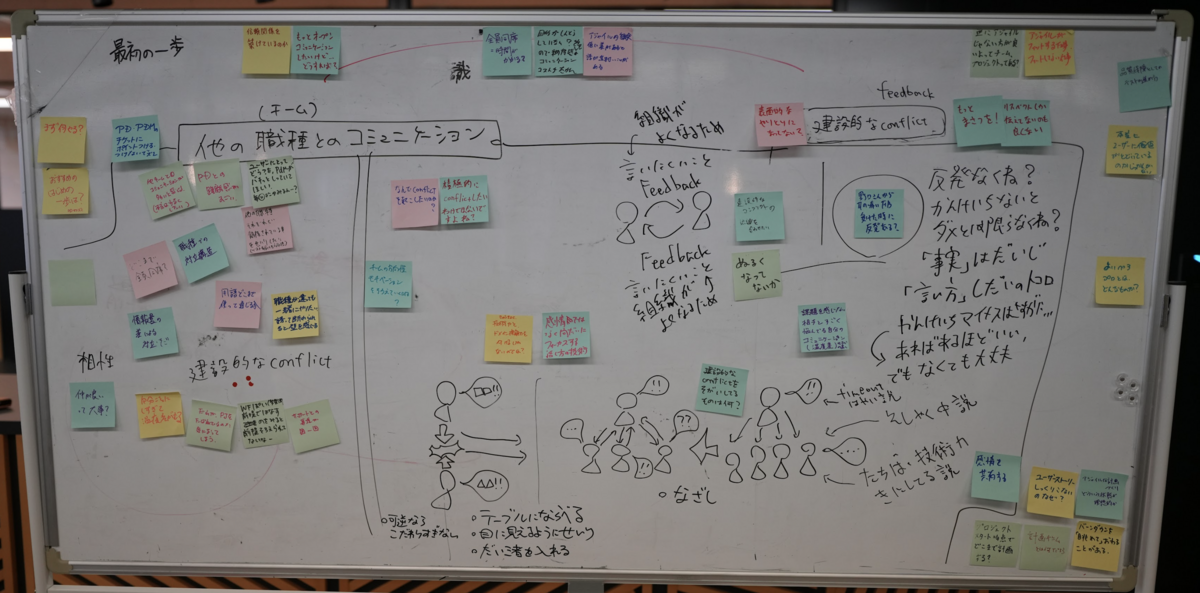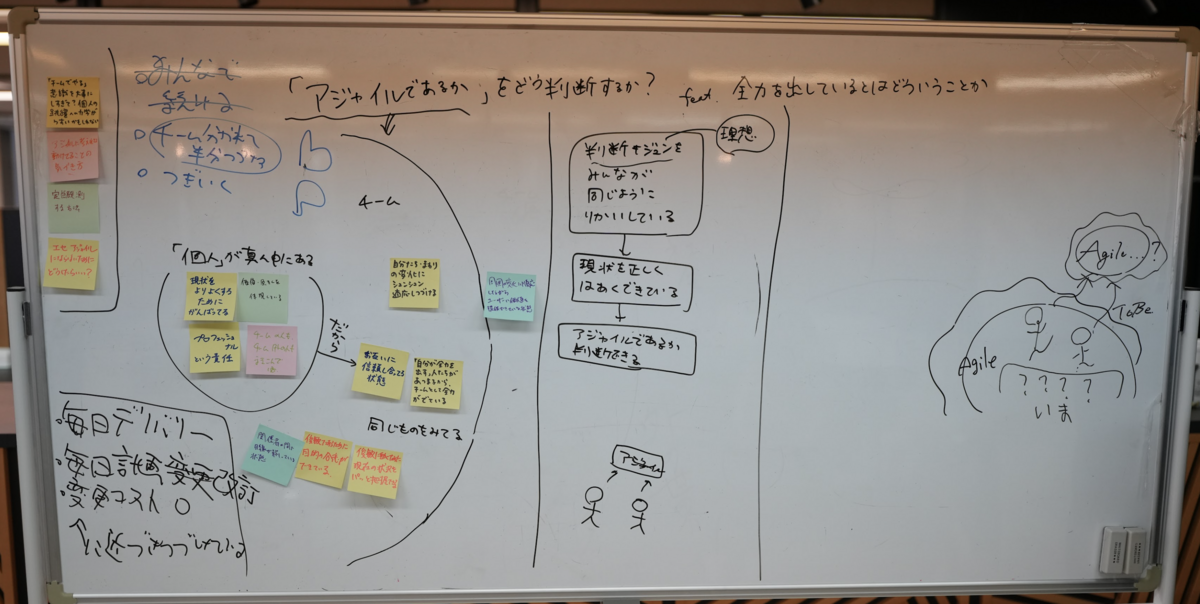 午後の部はオフィスで実際にホワイトボードと付箋を使って対面でのグループワークを実施しました! 開発チームで抱えている具体的な課題や、よりアジャイルな組織にしていくためにはどうすればいいのかというテーマについて、ここでもエンジニアだけでなくプロダクトマネージャー、デザイナーも含めてそれぞれの視点での課題やアイディアを出し合い、未来に向けた施策や各チームに持ち帰って実践したいことなどを整理することができました。
