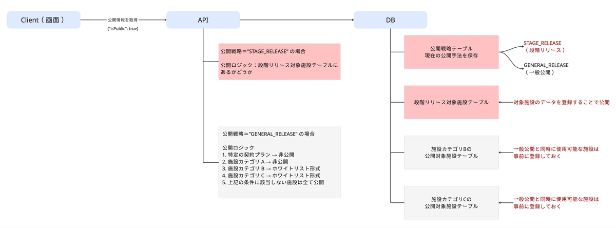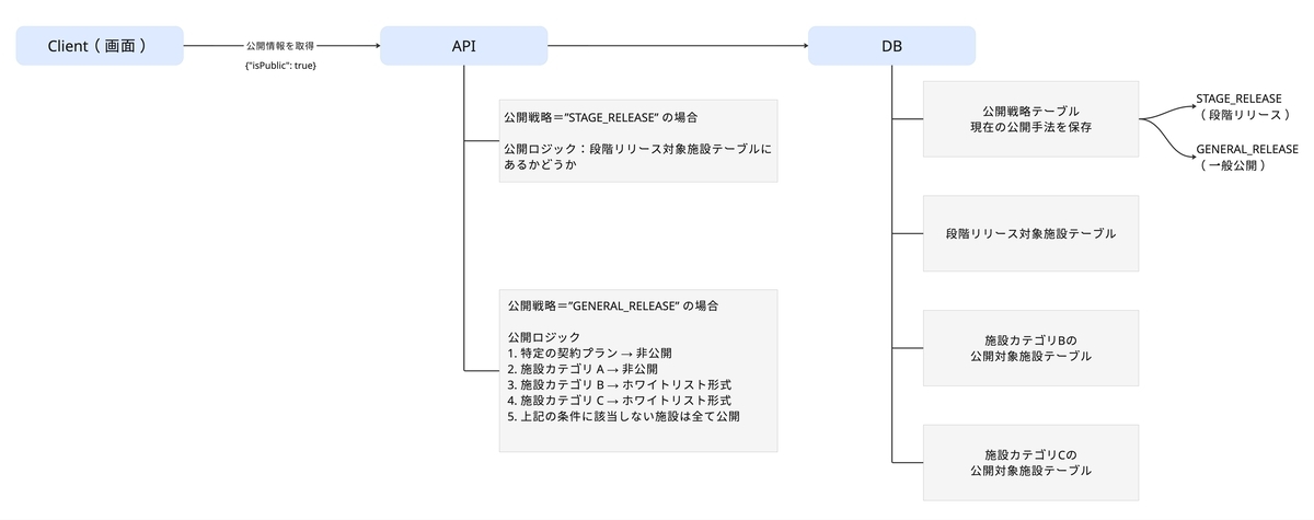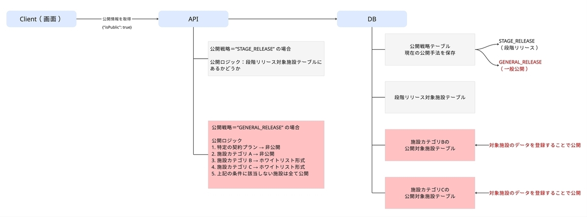 ポイントは、公開戦略テーブルに、現在の公開方法を管理し、バックエンド側で公開戦略に応じた公開条件の判定を行うようにしたことです。